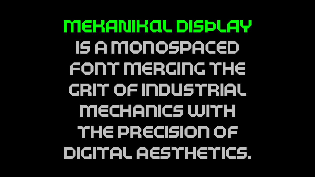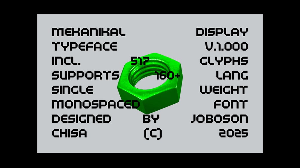 Mekanikal Display is a monospaced typeface created by Chisaokwu Joboson that merges the grit of industrial mechanics with the precision of digital aesthetics. Designed with beveled edges on curved glyphs and crafted at precise 45-degree cuts, Mekanikal Display mimics the geometry of mechanical nuts, bolts, and industrial parts. Its monospaced structure ensures uniformity and a digital-like rhythm, making it ideal for futuristic displays, tech branding, and experimental designs. This typeface bridges the gap between raw industrial forms and sleek modern design, adding a bold, functional edge to any project.