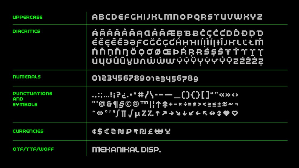 Mekanikal Display is available in following formats – OTF, WOFF and WOFF2